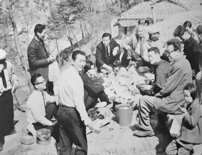 | 1974년 가을 동학의 발상지 용담정을 답사한 신라문화동인회 회원들. 가운데 검정색 양복차림의 석총 이상구와 그 옆 백발의 석당 최남주.(사진제공 신라문화동인회) |