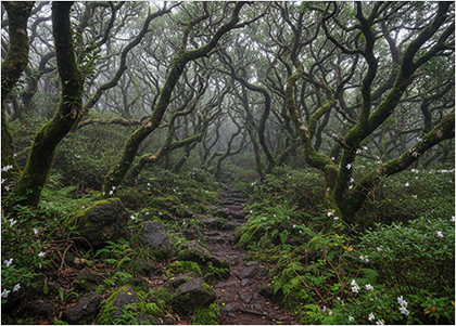 나무와 덩굴이 마구 엉클어진 신비로운 숲입니다.