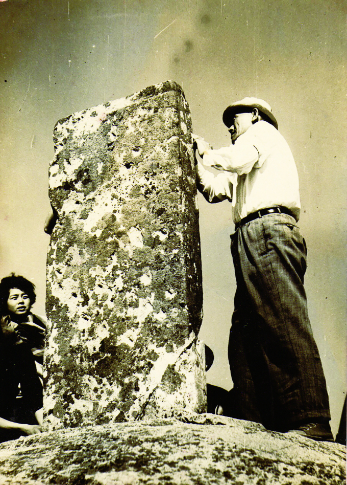 | 1961년 북한산 진흥왕 순수비를 탁본하는 최남주. 그는 답사현장에서 사학과 학생들에게 신라금석문의 중요성을 강의했다.(사진제공 석당 최남주 앨범) |